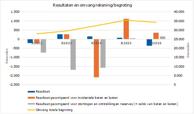 - De eerste kolom betreft het totaal resultaat. Het jaarrekeningresultaat was in 2022 negatief en in 2023 en 2024 positief. Voor 2025 is een sluitende begroting vastgesteld, de begroting 2026 sluit met een negatief saldo.