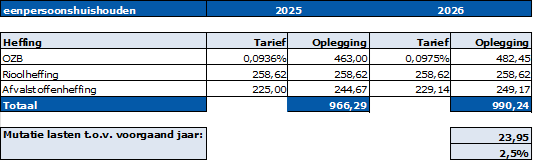 Op basis van de voorlopige tarieven voor 2026 laten de tabellen hieronder zien hoe de lasten voor inwoners veranderen.