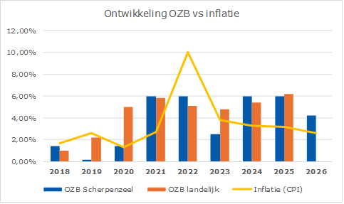 In de jaren 2021, 2022, 2024 en 2025 is de OZB gestegen met 6%.